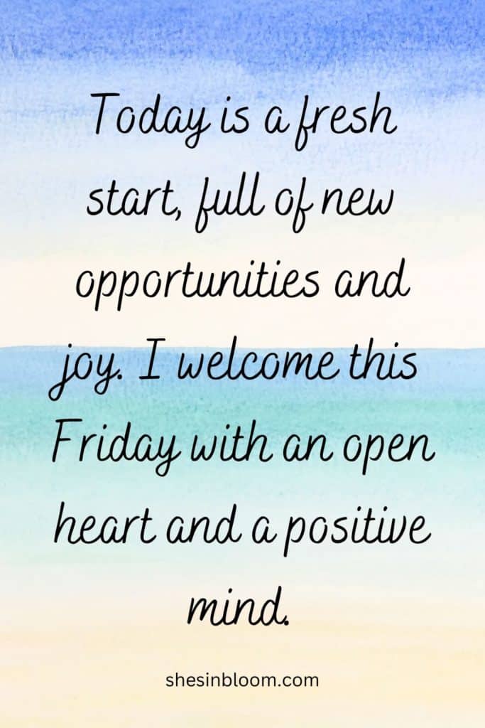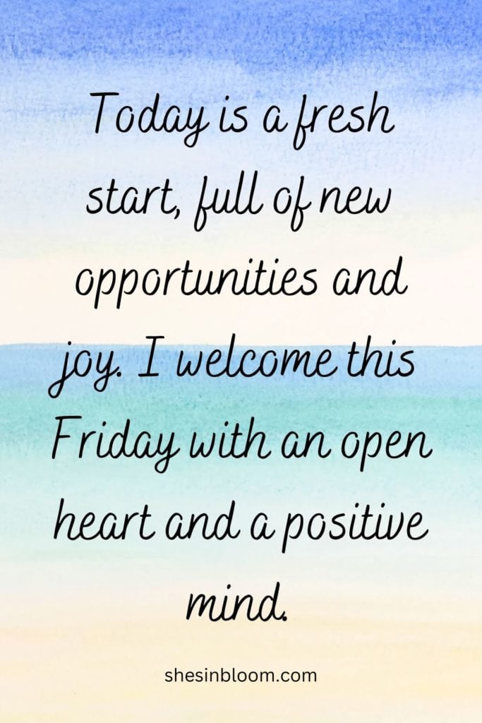 11. Bright Beginnings Today is a fresh start, full of new opportunities and joy. I welcome this Friday with an open heart and a positive mind.