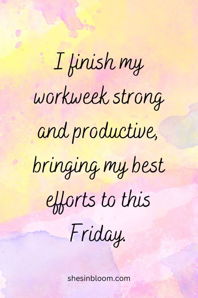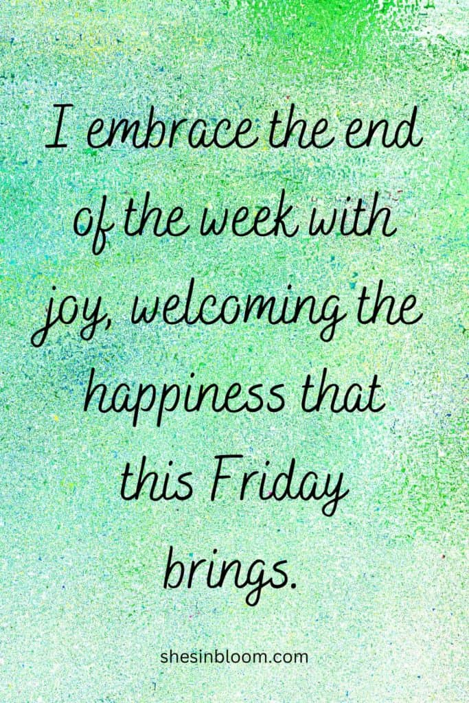 I embrace the joy and possibilities that this Friday brings. I am ready to conclude my week with strength and start my weekend with happiness.